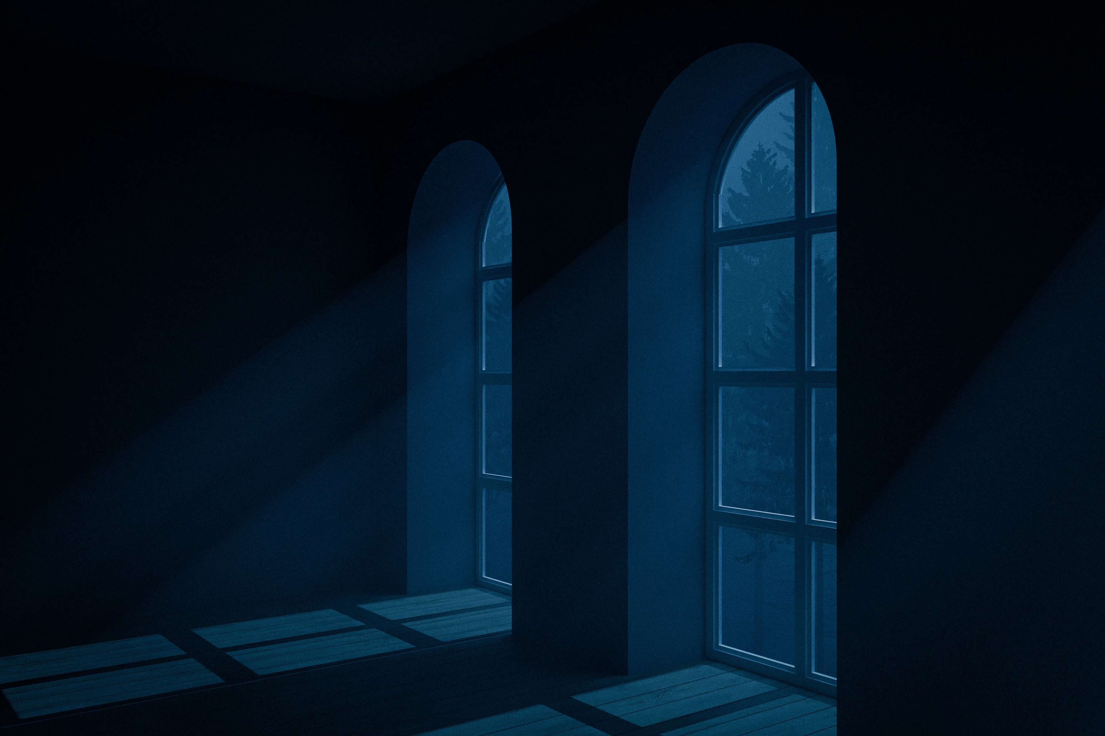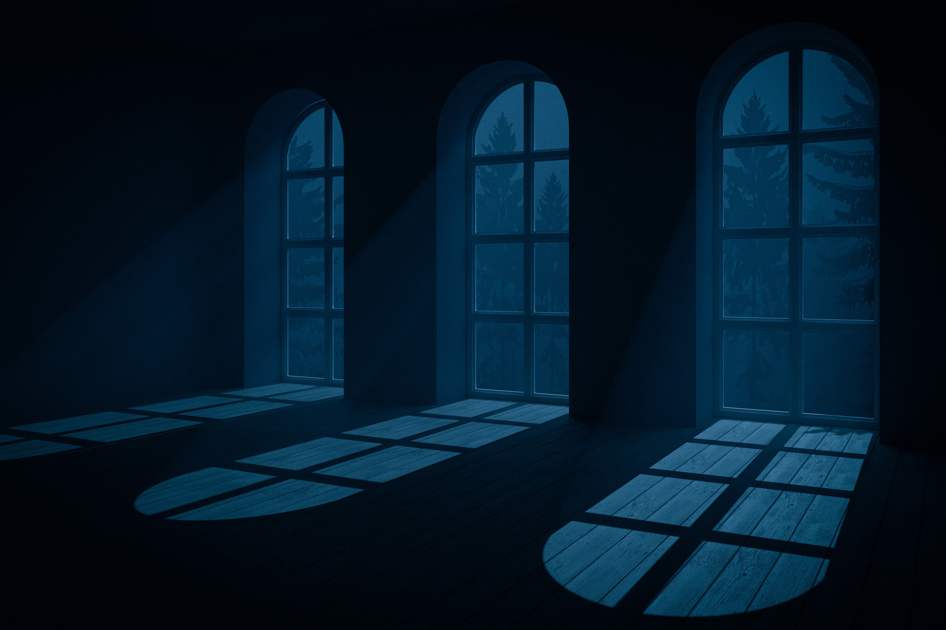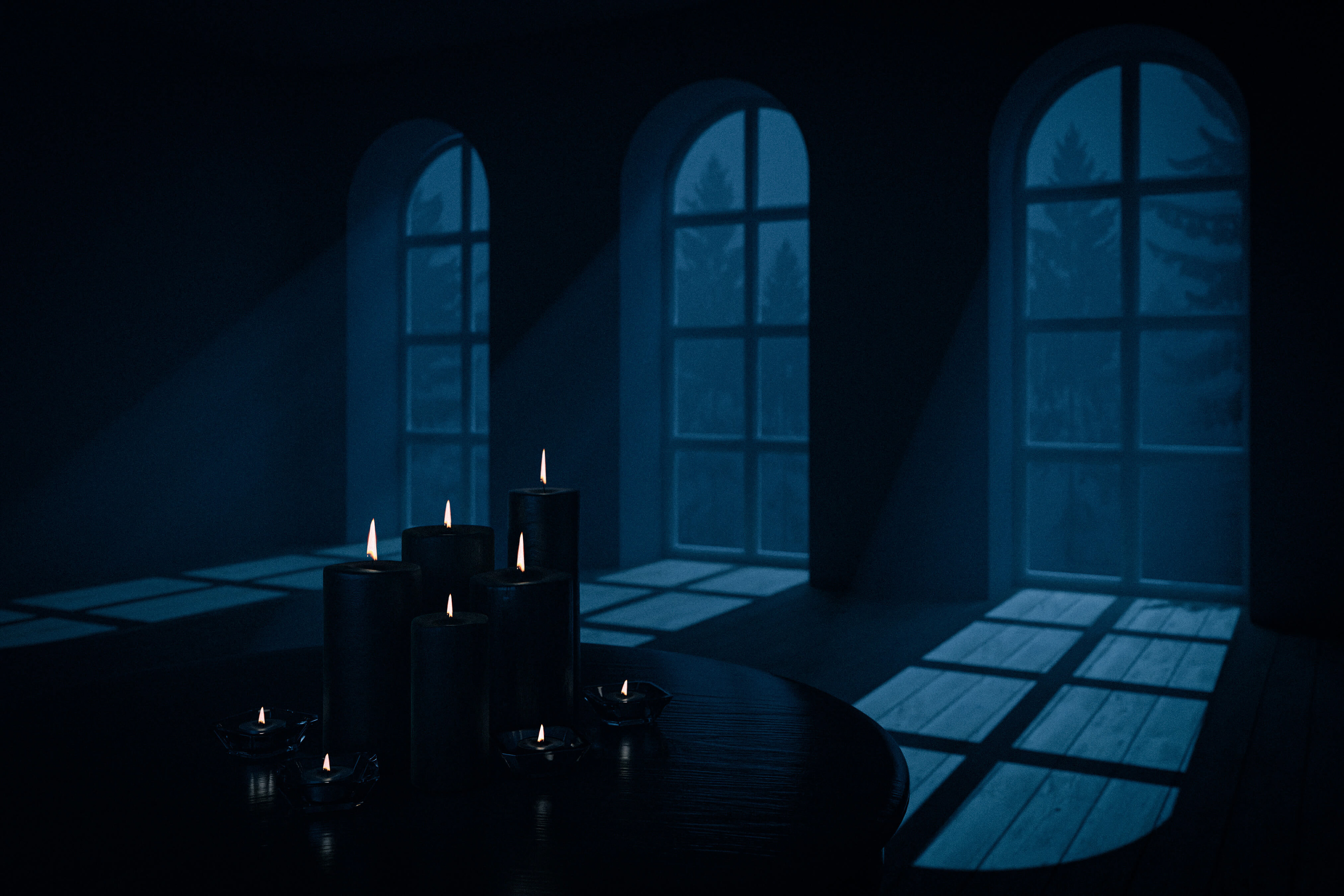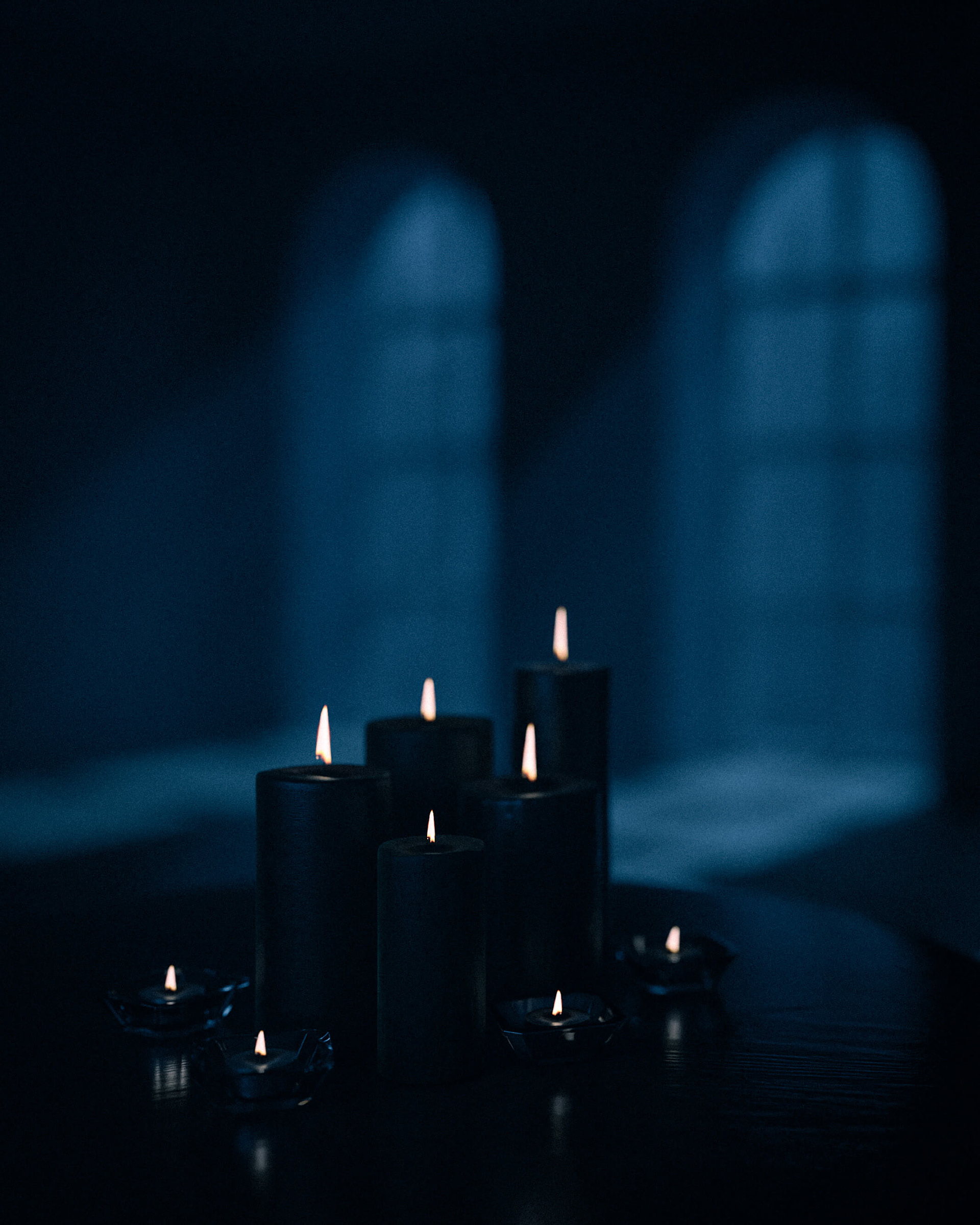 Die 3D-Komposition „Flackern“ wurde von der Musik Eden Bleaks inspiriert, die durch eine geheimnisvolle Mystik geprägt ist. In seinem Lied „Flackern“ singt er unter anderem: „Das Mondlicht fällt über den Tau. Durch hohe Fenster in den Raum.“ Diese Zeilen ließen sofort das Bild eines von Mondlicht durchfluteten Raumes mit großen Bogenfenstern in mir entstehen – ein geheimnisvoller Ort, verborgen tief im Wald. Dieses Bild ging mir nicht mehr aus dem Kopf, und so beschloss ich, die Szenerie in der 3D-Software Blender zum Leben zu erwecken. Dabei griff ich überwiegend auf vorgefertigte Modelle zurück, wie den Tisch und die Kerzen, während ich die Fenster und Bögen manuell in Blender gestaltete. Beim Rendern experimentierte ich dann mit verschiedenen Kameraperspektiven und Blenden-Einstellungen, um die mystische Stimmung noch intensiver einzufangen.